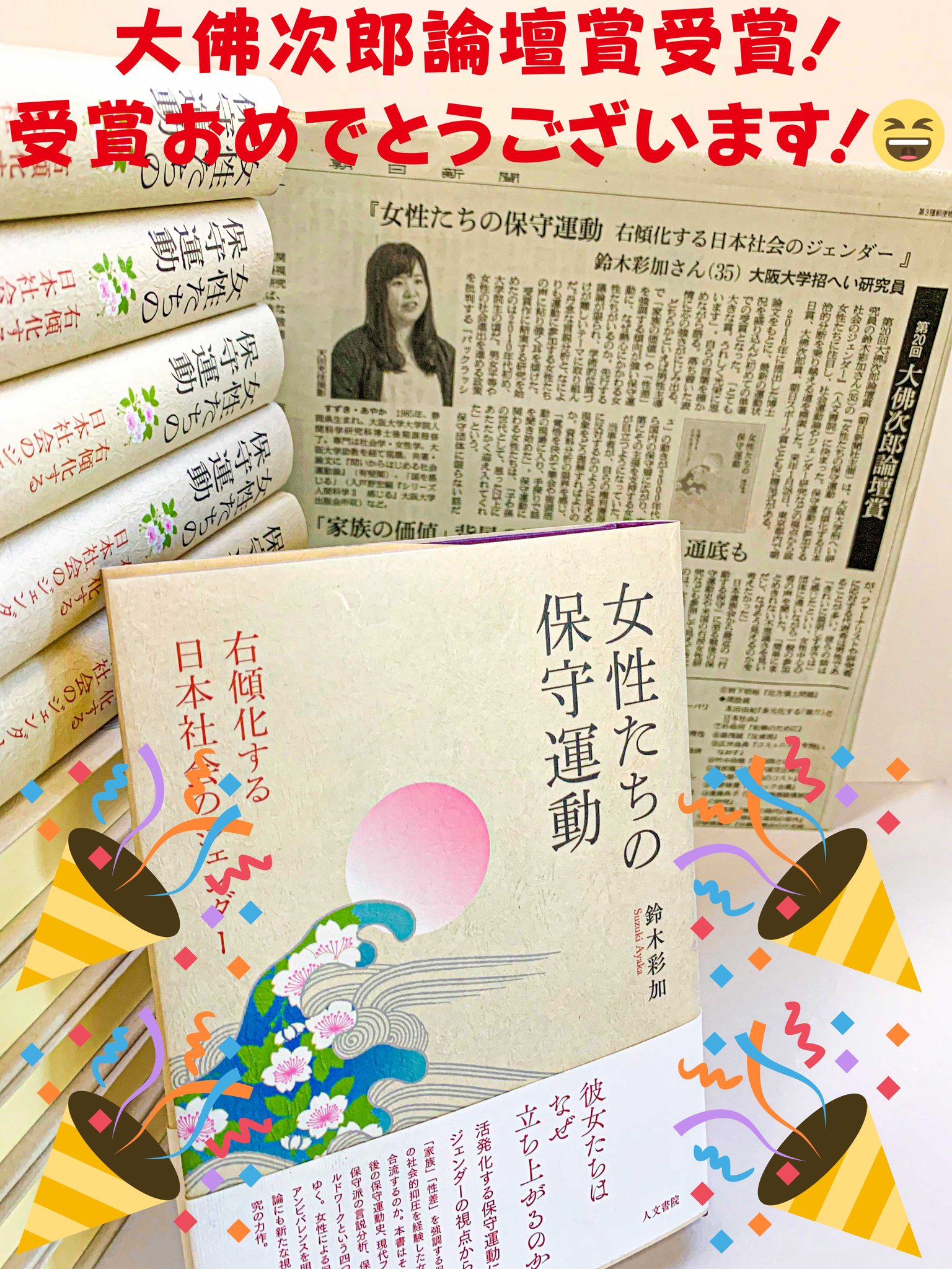 人文書院 V Twitter 昨年末に刊行した 鈴木彩加著 女性たちの保守運動 右傾化する日本社会のジェンダー が 第回大佛次郎論壇賞を受賞し 本日の朝日新聞で発表されました 鈴木さん おめでとうございます 弊社としても初の受賞です T Co Idfsjymjzz
